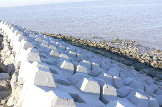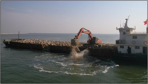 東營港廣利港區位于萊州灣的西部、廣利河河口處,距東營市城區約20km,東與膠東半島緊貼相連,西與濱州地區接壤,南與淄博、濰坊兩市相毗鄰,處在膠東半島和遼東半島的環抱之中。本工程位于廣利港區北作業區。本工程西側與廣利港區防波堤工程相連,東側至規劃初期口門,工程全長5126m。其中4+444~8+065為直線段,軸線方位為251°—71°,長度為3621m;8+065~9+570為折線段,軸線方位為259.5°—79.5°,長度為1505m;兩段防波堤軸線夾角約為8.5°。本工程4+444~8+065為出水堤,堤頂高程為2.0m;8+065~9+570堤頂高程由2.0m漸變至-1.0m。